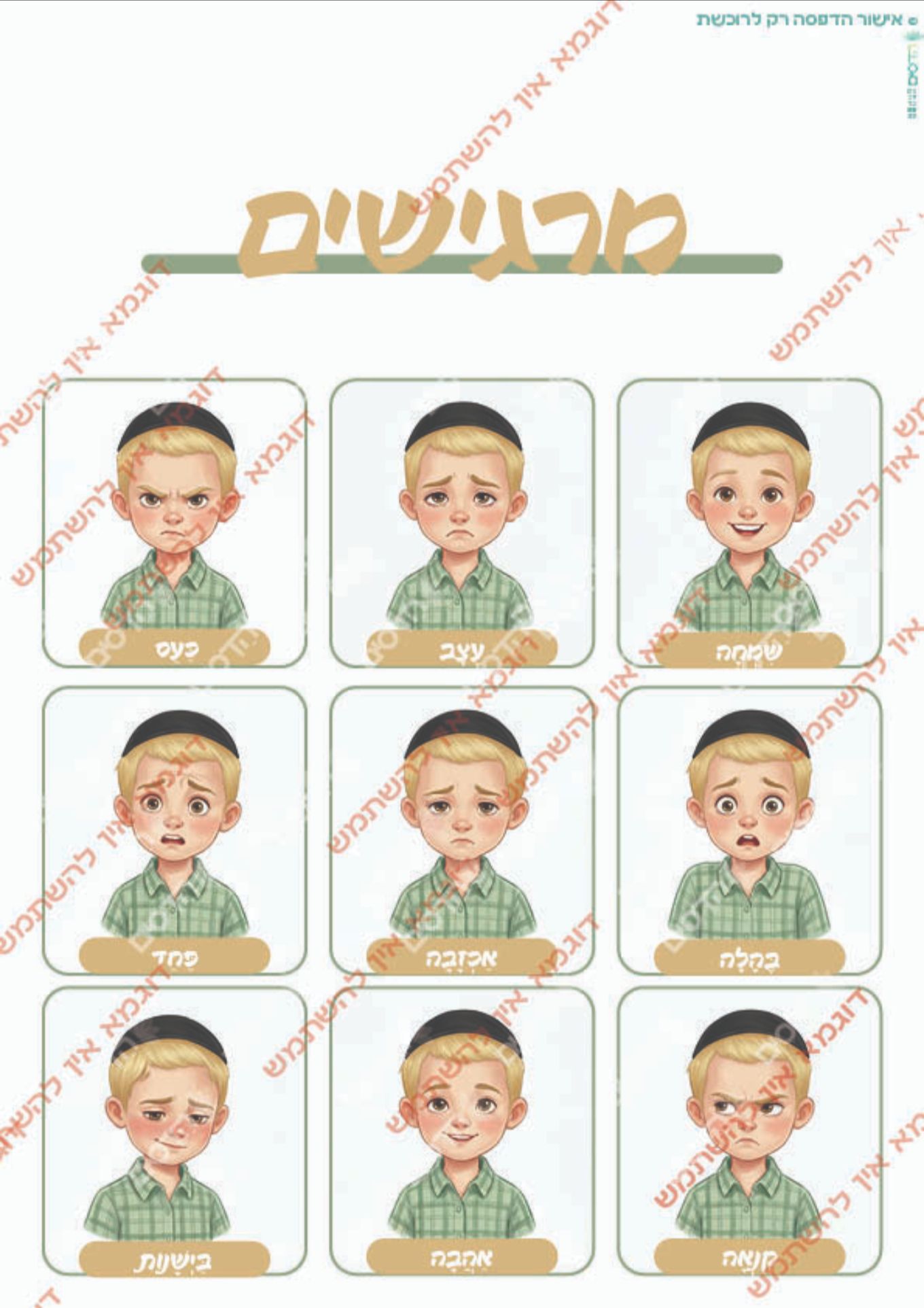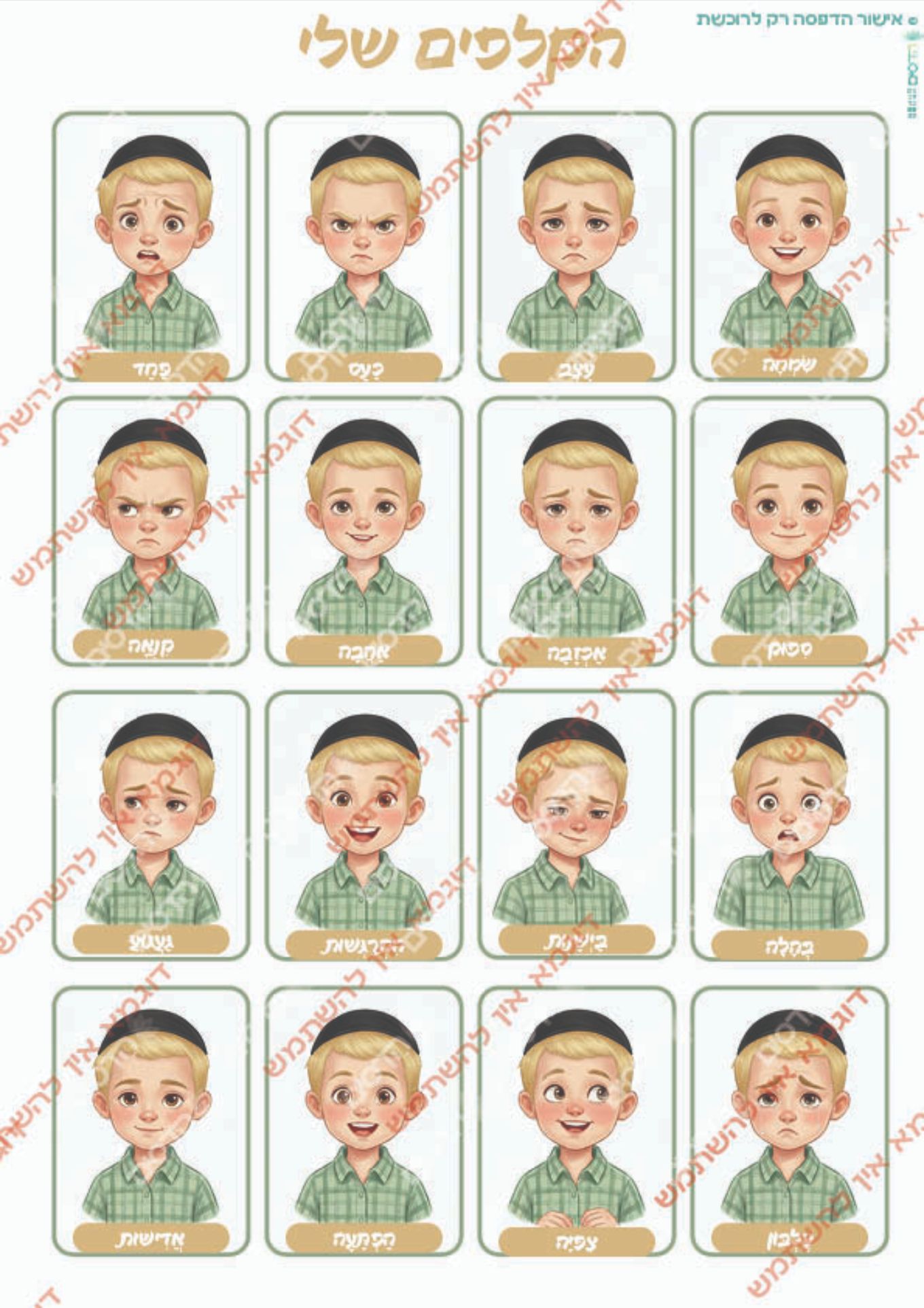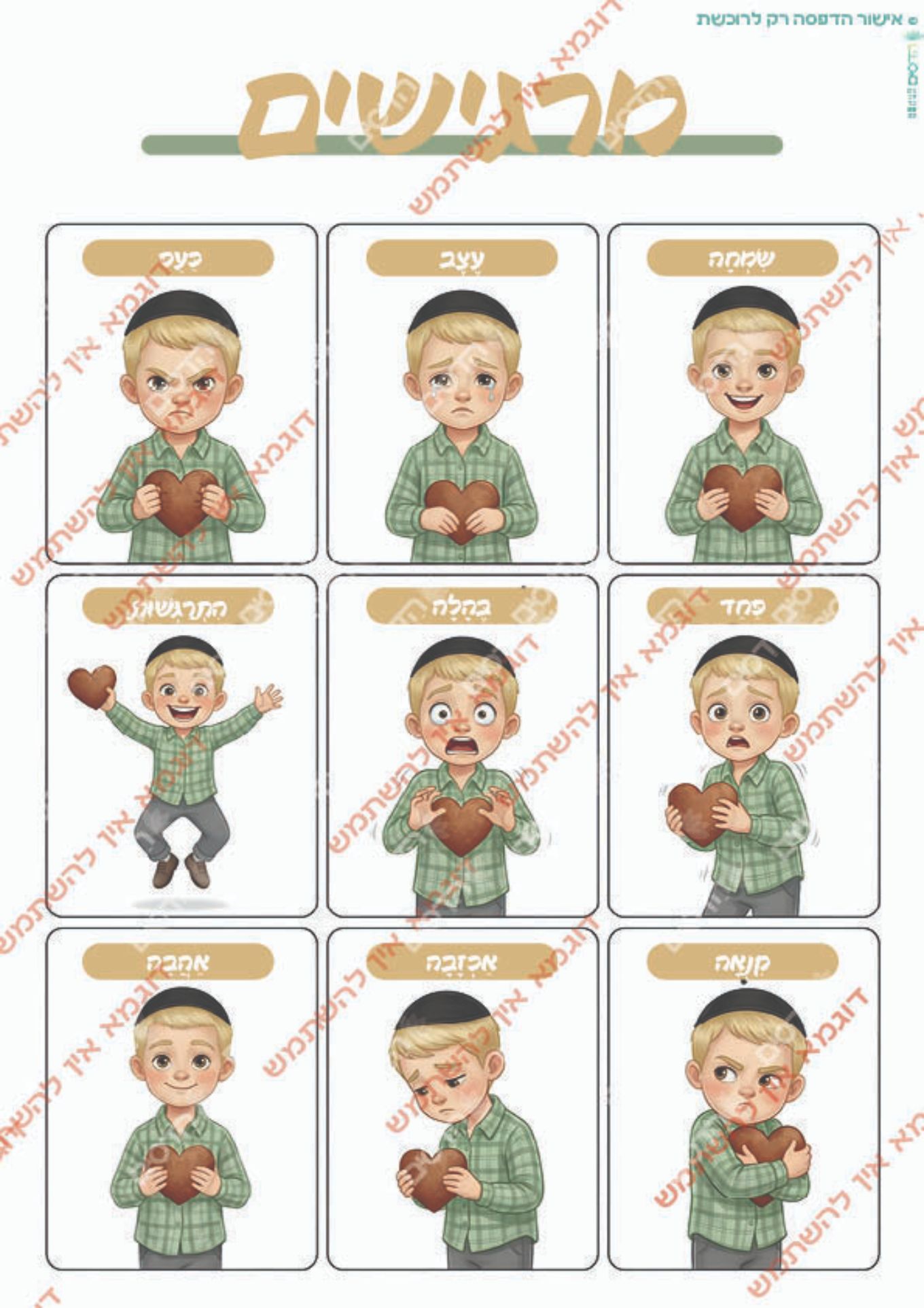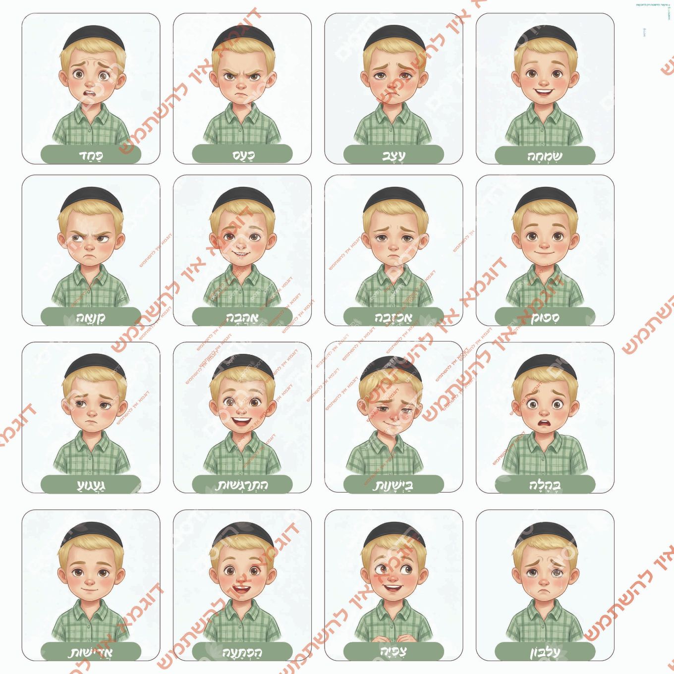 בנוסף תמצאו לוח רגשות מלא ולוח של 9 רגשות בסיס שעון, וסרגל ולוחות נפרדים לכל רגש – להדפסה ושימוש גמיש בבית, בכיתה או בקליניקה.
